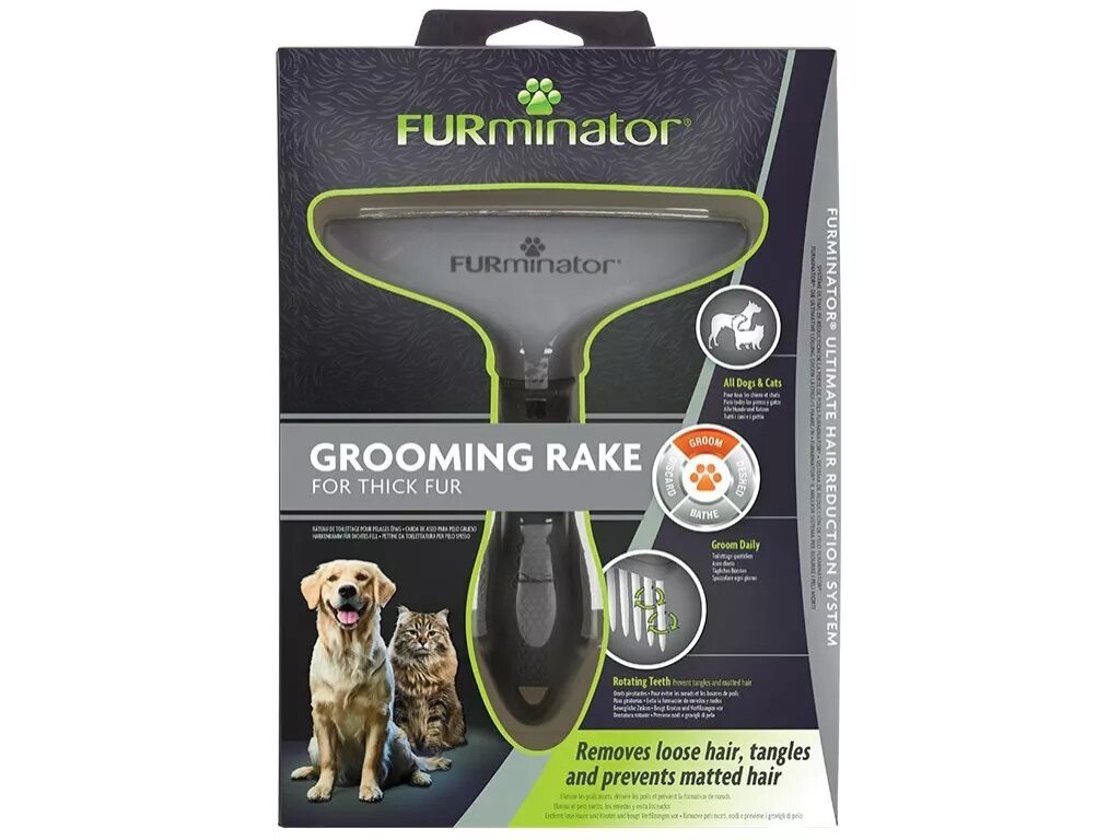 FURminator Grooming Rake je hřeben s otočnými zuby pro snadné rozčesání husté srsti a podsady. Ideální pro psy se středně dlouhou až dlouhou, vícevrstvou srstí.