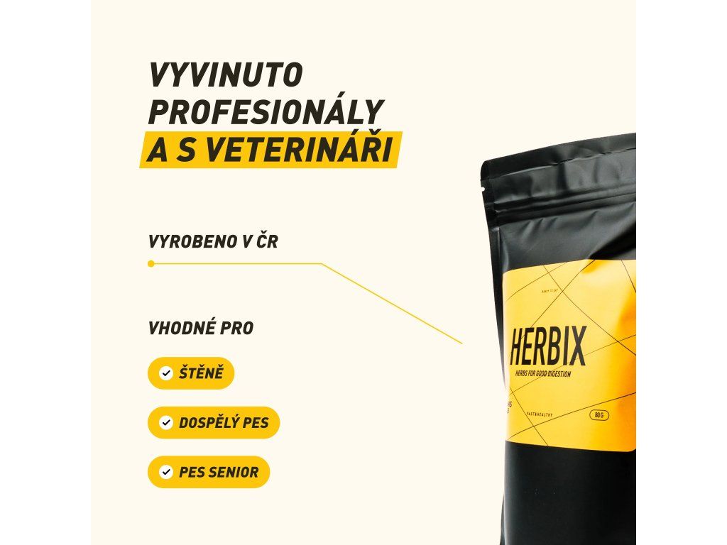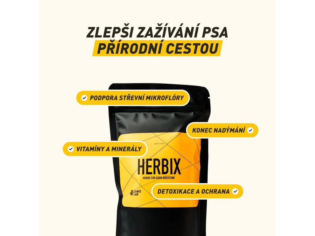 Herbix je směs bylin a prebiotik, kterou jednoduše zamícháte do krmiva pro podporu trávení a střevní mikroflóry. Hodí se ke granulím i k syrové stravě, když chcete psovi ulevit od citlivého bříška a zlepšit využití živin.
