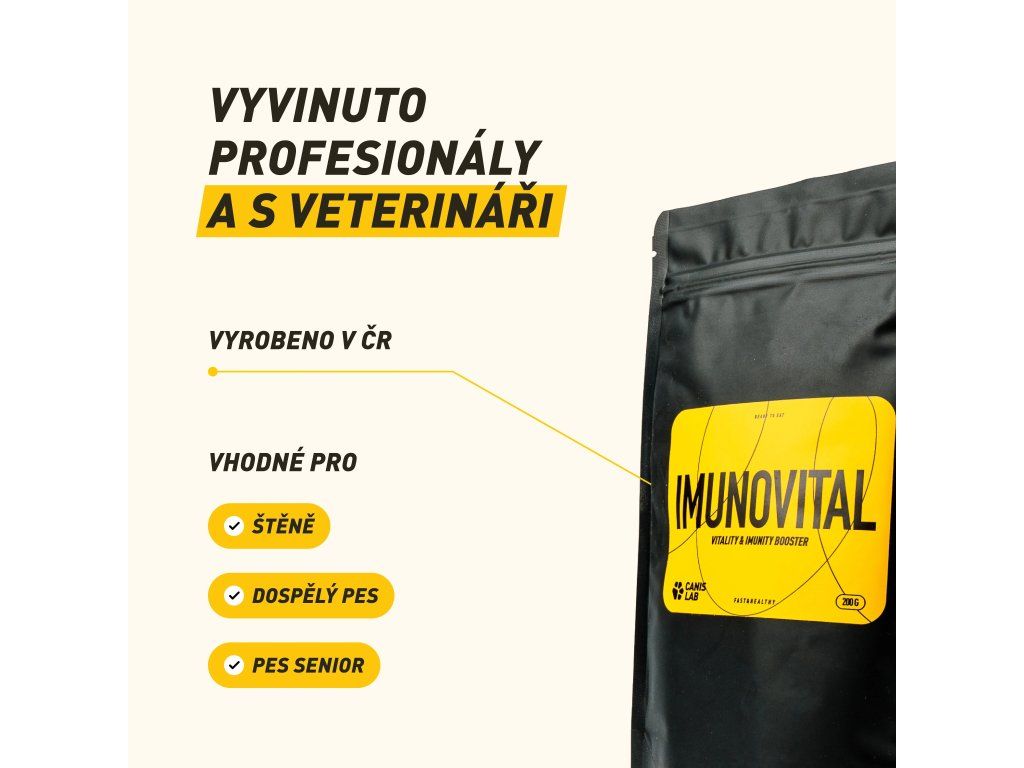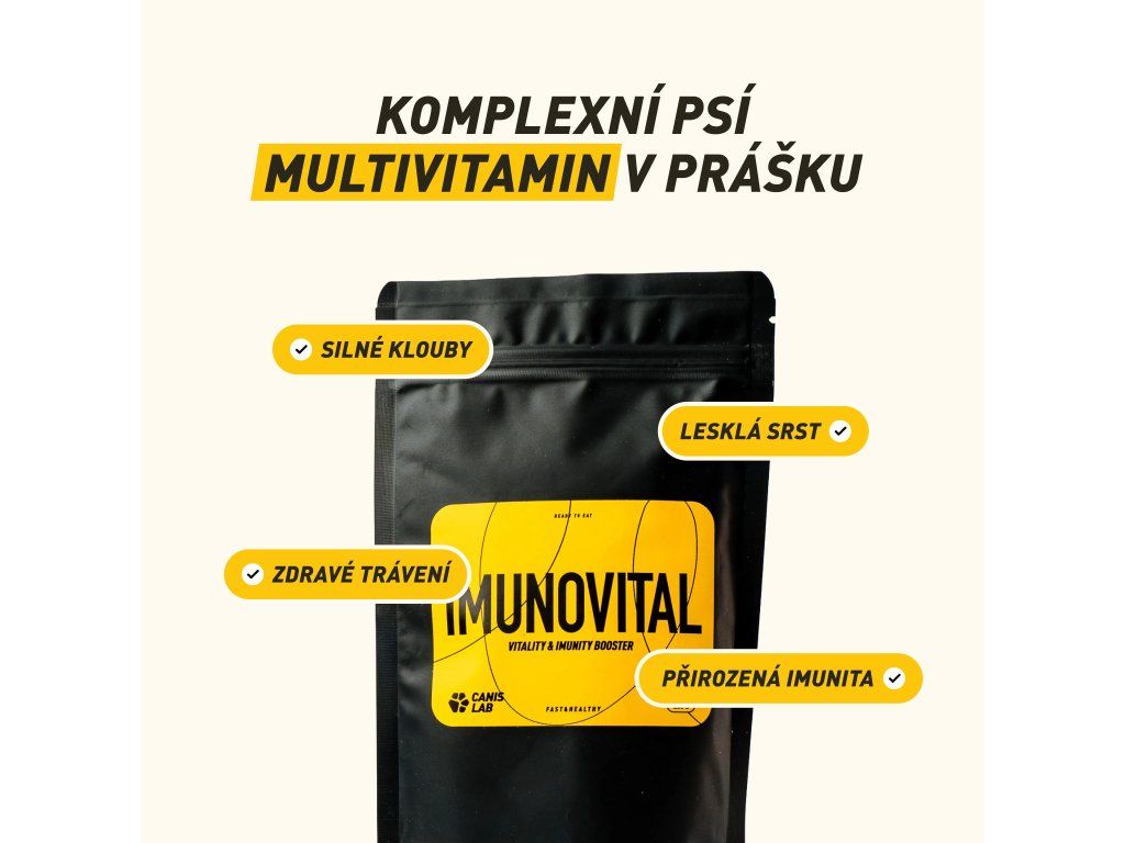 Imunovital je multivitamin v prášku, který jednoduše zamícháte do krmiva a doplníte psovi široké spektrum živin. Hodí se pro každodenní podporu imunity, vitality, srsti i celkové kondice – od štěněte až po seniora.