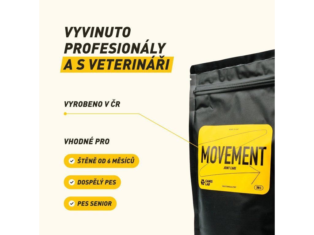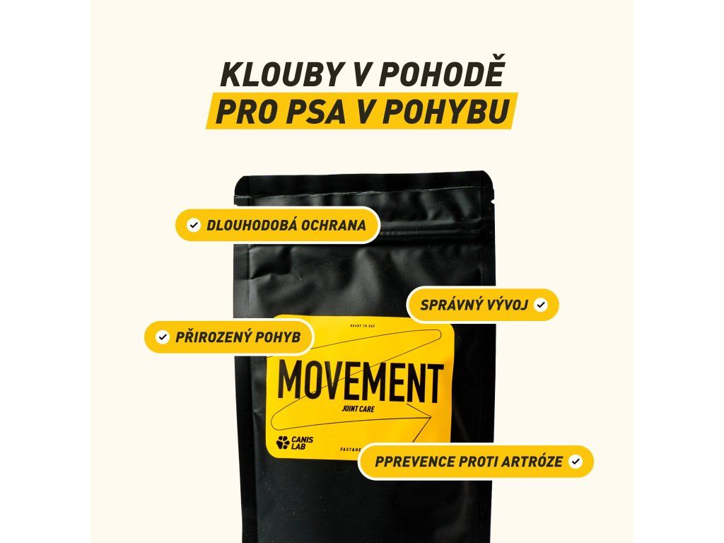 Klouby dostávají zabrat nejen při sportu, ale i při běžném aktivním životě – při skocích, rychlých změnách směru, dlouhých túrách nebo postupně s věkem. Movement od Canis Lab je intenzivní kloubní výživa v prášku, která má za cíl klouby dlouhodobě vyživovat a chránit. Díky práškové formě ji jednoduše nasypete do misky a zamícháte, takže je vhodná i pro psy, kteří odmítají tablety.