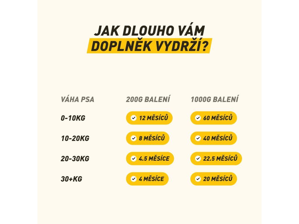 - Dávkování: na každých 10 kg hmotnosti psa 0,5 g denně (prevence) až 1 g denně (intenzivní výživa).