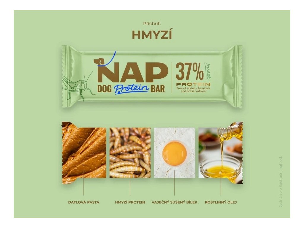 NAP Hmyzí proteinová tyčinka pro psy je proteinová tyčinka vytvořená s ohledem na potřeby psů v zátěži – ať už sportují, chodí po horách, nebo jsou jednoduše často v pohybu. Základ tvoří datlová pasta jako přirozený zdroj energie a pojivo, doplněná o hmyzí protein z moučného červa a vaječný sušený bílek jako kvalitní zdroje bílkovin.