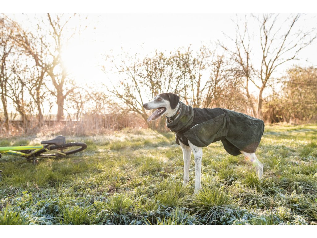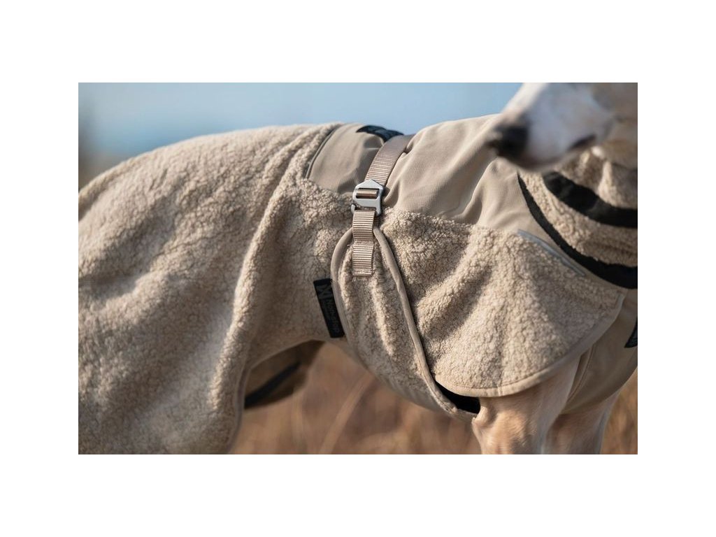 Bunda je vícebodově nastavitelná (průkrčník, krk, hrudník, kořen ocasu), má gumičky na zadní nohy pro stabilní usazení a reflexní detaily. Zapínání řeší lehká hliníková spona.