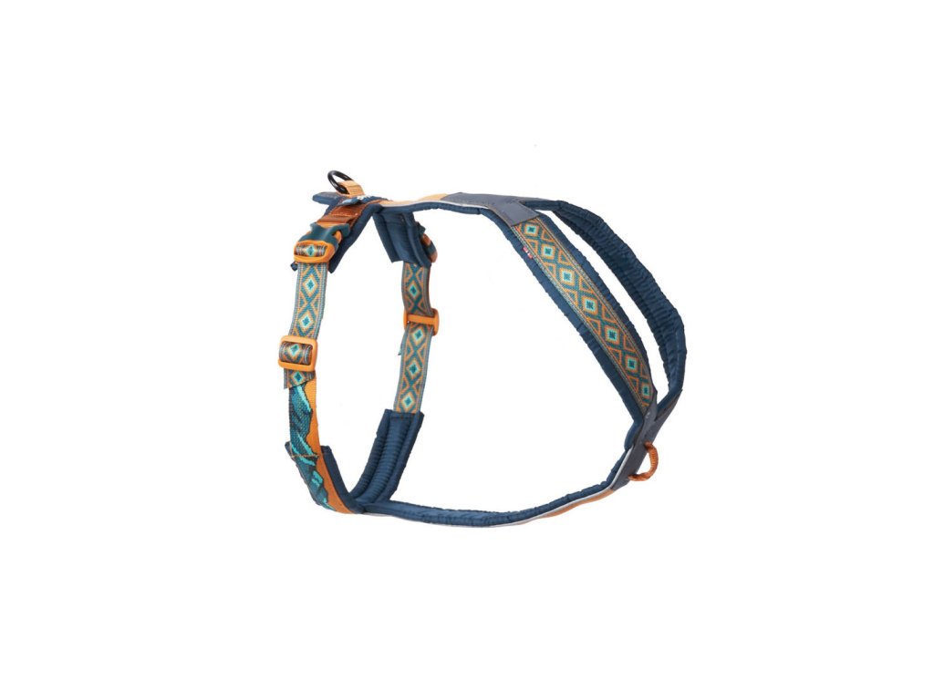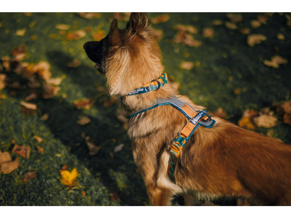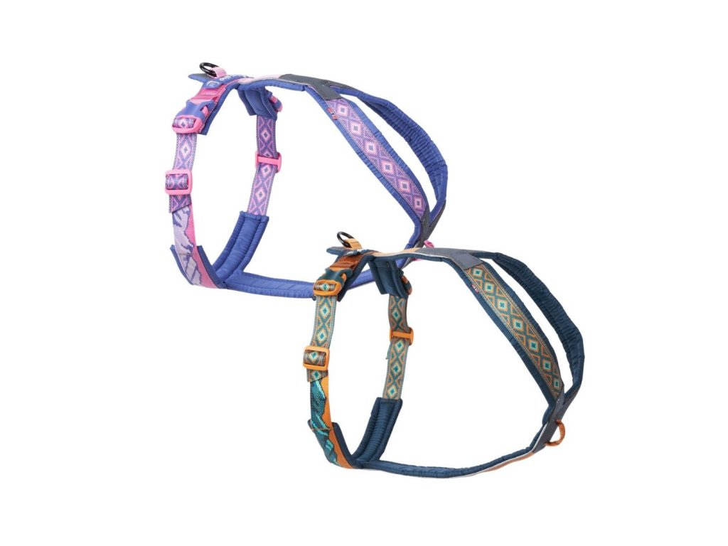 K dispozici jsou 3 body připnutí vodítka: D-kroužek na zádech, spodní očko pro stopovačku a od velikosti 3 také přední úchyt pro mírné omezení tahání. Edici doladíte obojkem, vodítkem a ledvinkou ve stejném designu. Velikosti 1–8 pokrývají malé i velké psy.
