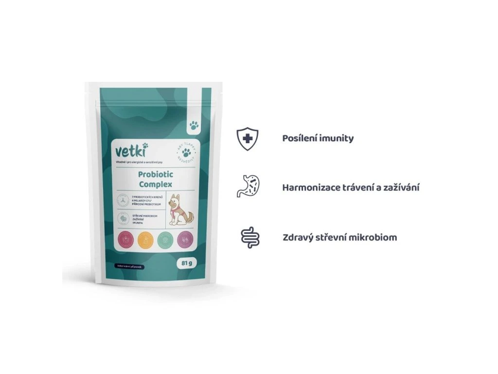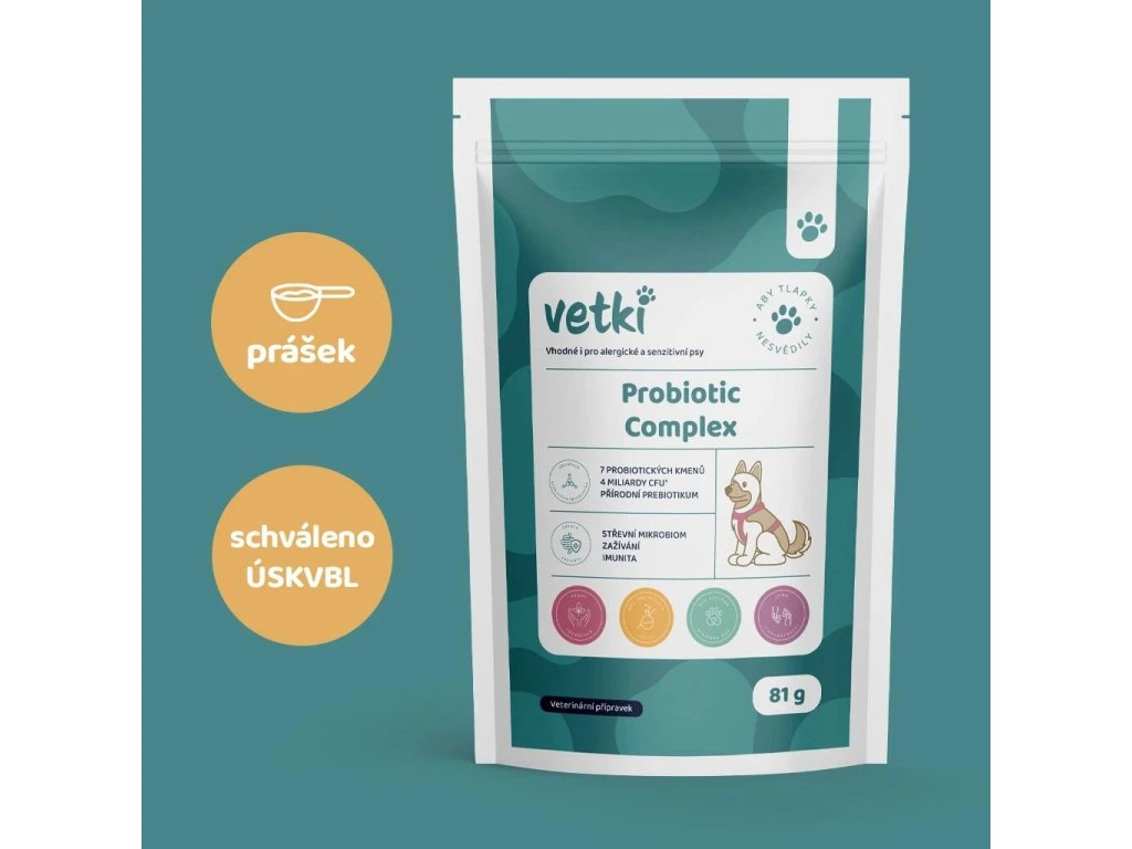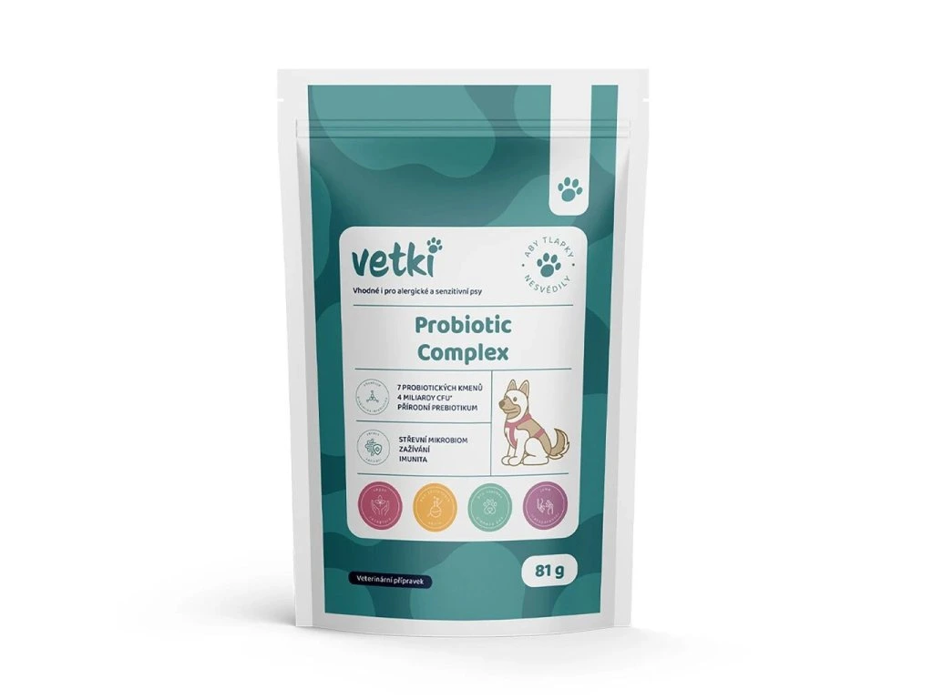 Probiotic Complex od vetki jsou probiotika a přírodní prebiotika pro psy s citlivým trávením, po antibiotikách nebo při zažívacích potížích. Pomáhají podpořit rovnováhu střevní mikroflóry, zdravé trávení i imunitu a díky jemné práškové formě se snadno přimíchají do krmiva.