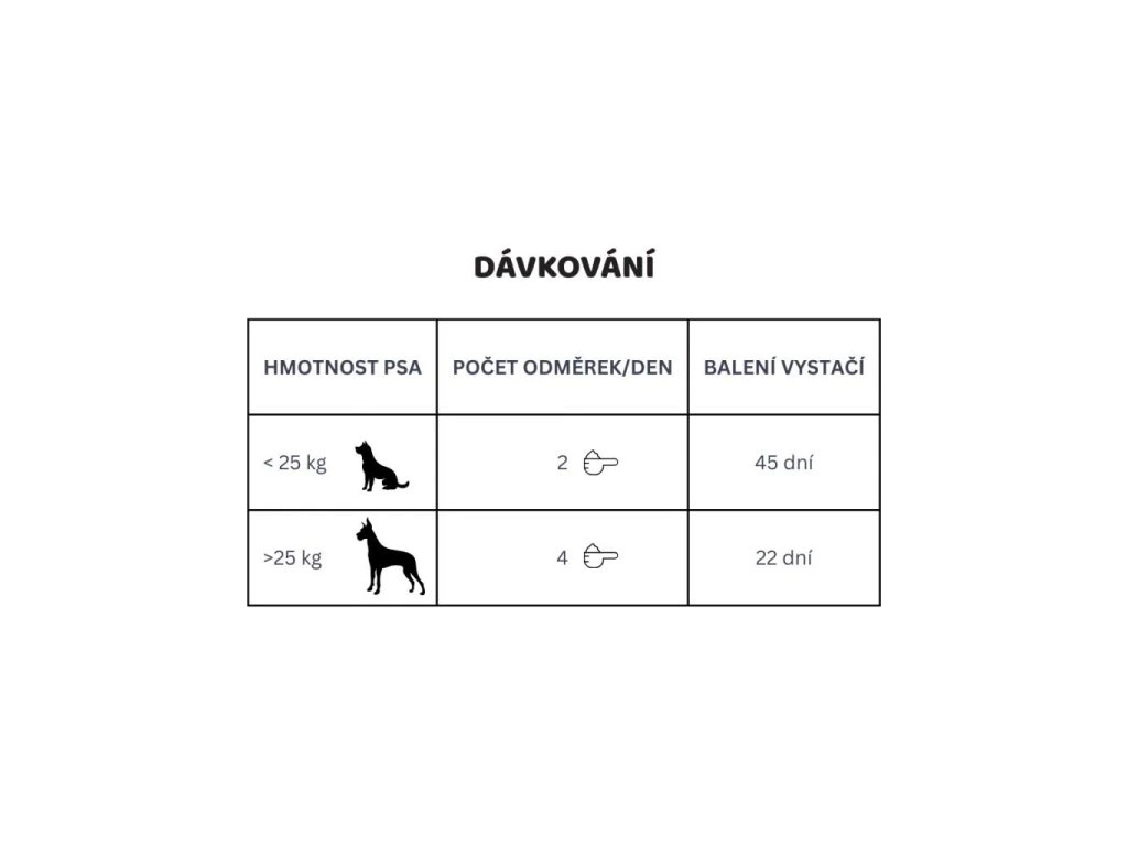 Podávejte denně podle hmotnosti psa. Malý pes do 25 kg: 2 odměrky denně. Velký pes nad 25 kg: 4 odměrky denně. Balení vystačí přibližně na 45 dní u psa do 25 kg a na 22 dní u psa nad 25 kg.