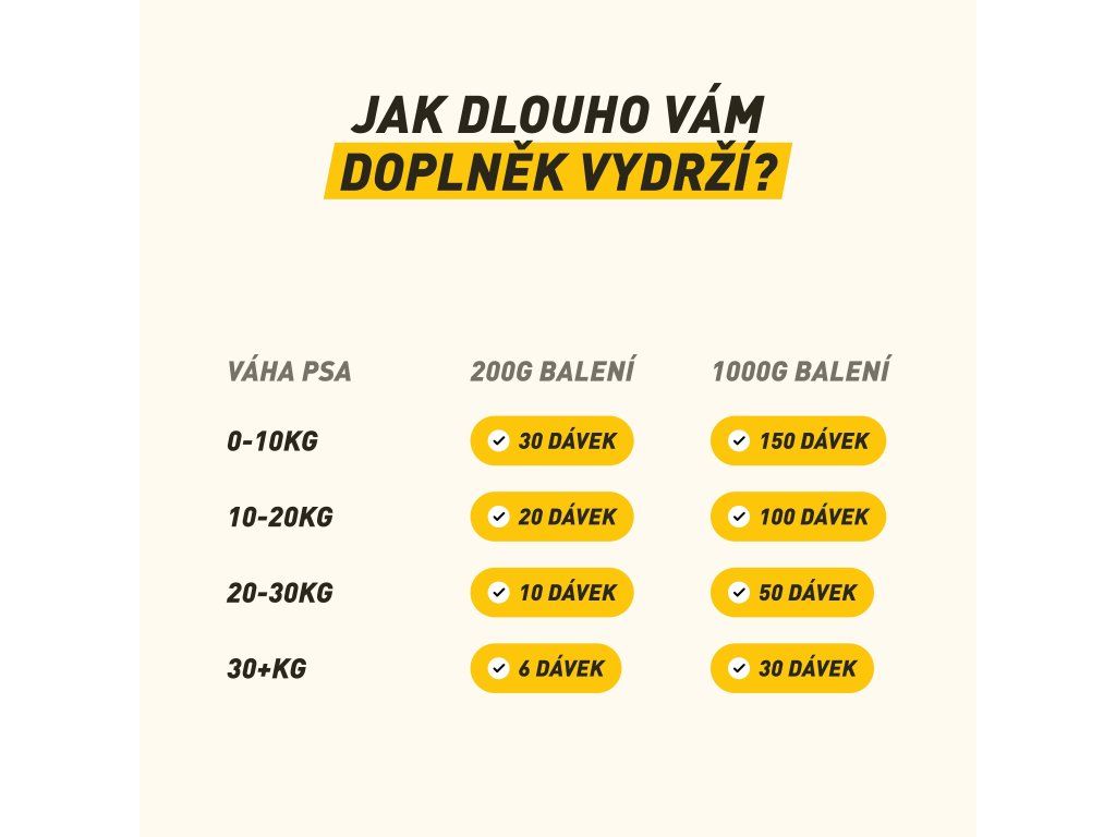 - Doporučení: začněte na nižším množství a dávku postupně dolaďte podle zátěže a tolerance psa.
