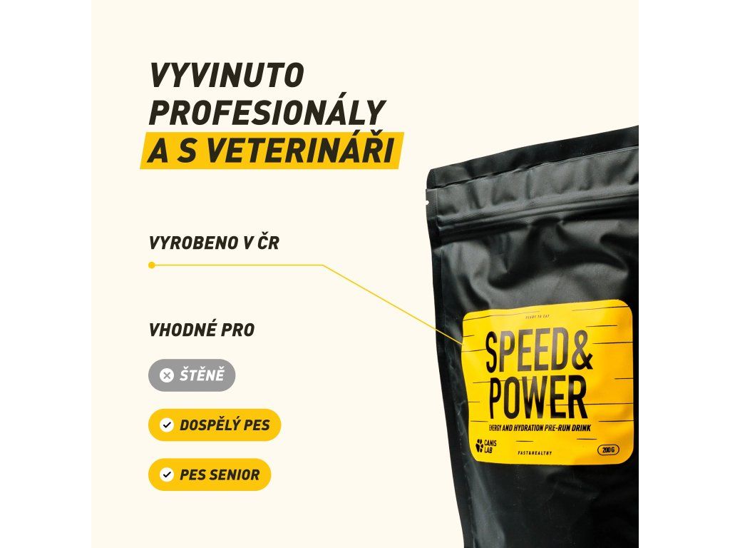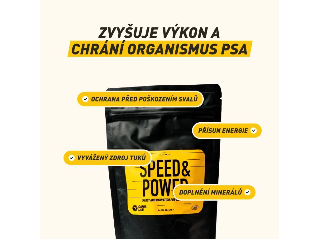 Speed & Power je energetický rehydratační nápoj pro psy před výkonem. Rozmícháte jej ve vodě a doplníte tekutiny, minerály a postupně uvolňovanou energii pro trénink i závod. Vhodné pro aktivní dospělé psy.